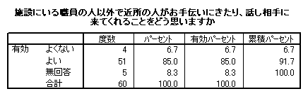 一方で、職員用アンケートを見ても、地域住民のインベント招待や、ボランティア参加を「望ましい」としている。しかし、この場合には問題の背景が異なっている。すなわち、次の二つの設問、「介護保険の影響」についてみると、情報開示、苦情相談など外部との関係は介護保険によって制度が構築されていくだろう、ということで評価されている。しかし、利用者とのコミュニケーションや人間関係という基本的な内部関係は、評価が著しく低くなっている。ここに重大な問題が存在している。職員は介護保険によって、利用者との関係がそこなわれる可能性がある、と考えているのである。