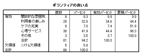 @は、介護保険の導入によりサービスが点数化され、そのため逆に直接処遇以外のサービスが点数化されないので、提供サービスが限られる。それをカバーするためにボランティアが重要であるという、消極的参加ということである。「終の棲家」であるはずの施設で、直接介護が重点的に行われるとしても、それ以外のサービスも必要なはずである。しかし現実には、「利用者と接する時間がない」というような不満が職員からも出されている。これは次項で実証する。