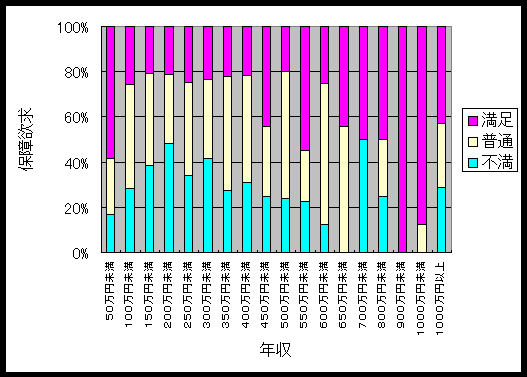 上のグラフから、年収別に現在の保障欲求の「不満」の回答の割合を見る。年収「50万円未満」から「200万円未満」にかけては、「満足」の回答の割合は減少してゆき「不満」の回答の割合は増加して行く。また、「200万円未満」を境に、「満足」の割合は増加してゆき、「不満」の割合は減少してゆく。「550万円未満」における「満足」の回答の割合が最も高く、「200万円未満」における「不満」の回答の割合が最も高い。