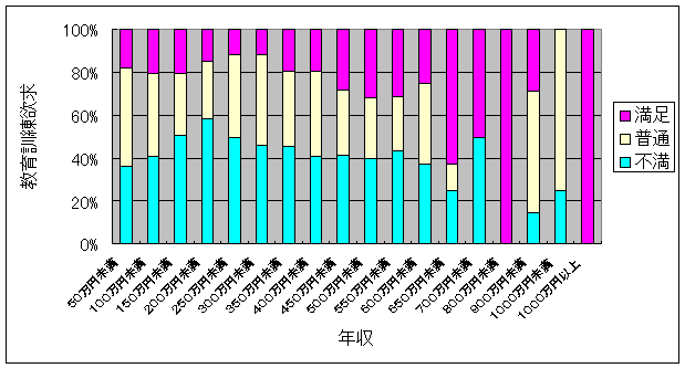 よって、教育訓練欲求の現在満足度と年収には関係があると言える。そこで、クロス集計表から次の事柄が判明した。