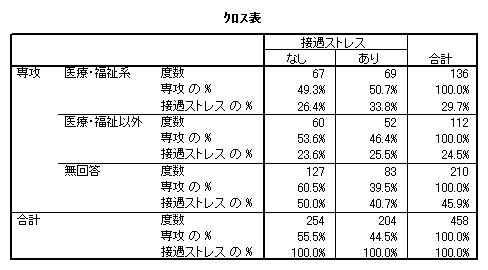 接遇方法に関しては、介護方法の研修などの勉強によって、より適切な対処ができると考えられている。そのため、福祉を専攻し学んでいた人のほうが、接遇方法に関するストレスは少ないのではないかという仮説を立てていたが、結果から見るに、福祉専攻者は、福祉の現場に対する理想が高いため、施設における不十分な接遇に職員自身の納得がいかず、逆に接遇方法に対するストレスを感じやすいのではないかと考えられる。